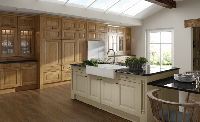 The ornate Jefferson door with its moulded, raised centre panel will bring your rural space to a different level. Available in oak or any painted finish, this range comes with a large selection of accessories for a classic kitchen design.